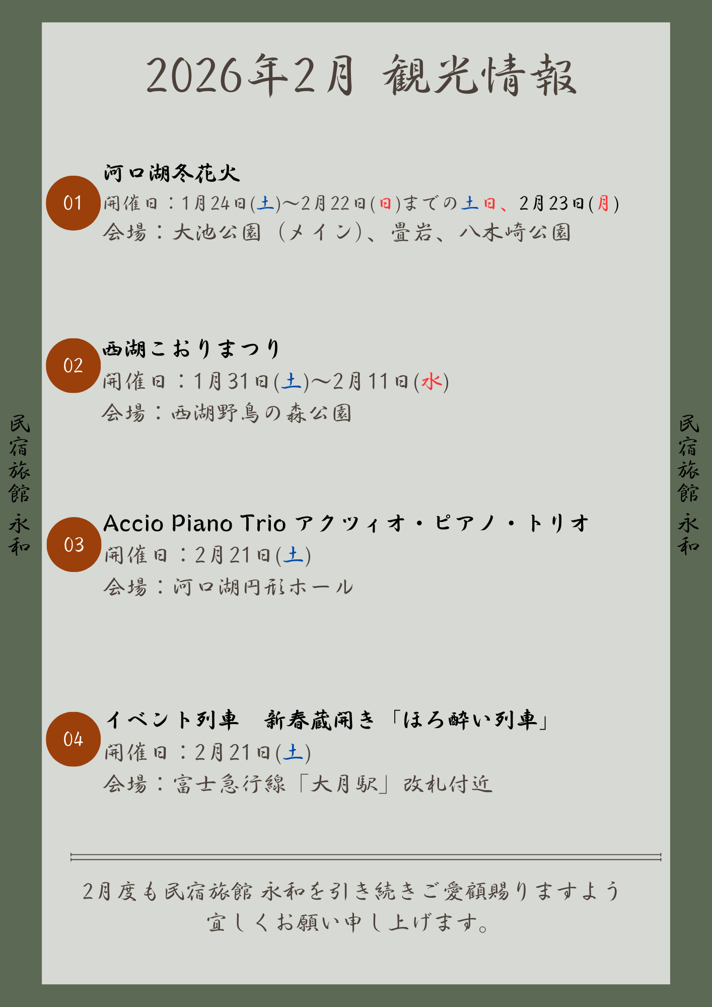 2月度も民宿旅館 永和を引き続きご愛顧賜りますよう宜しくお願い申し上げます。