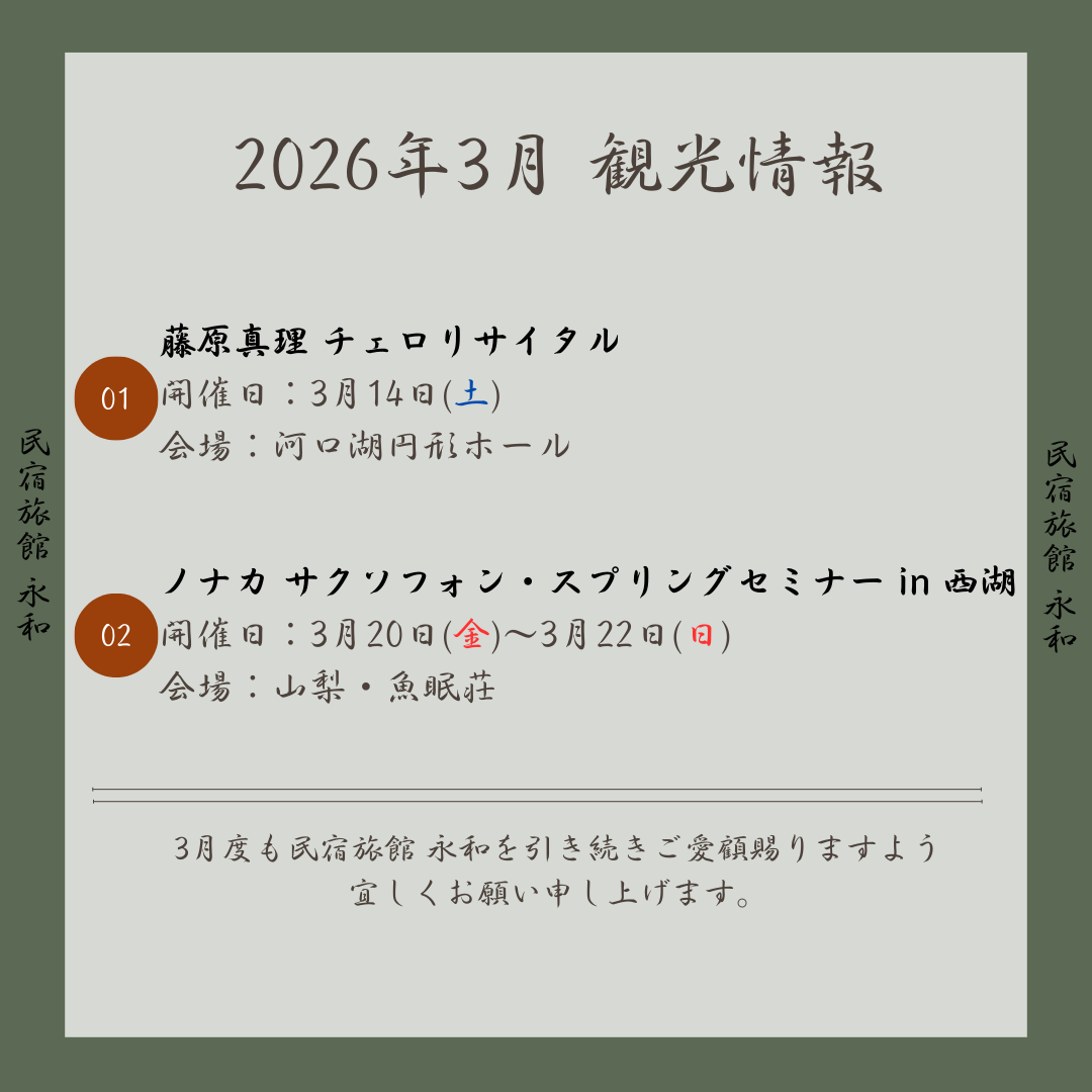 3月度も民宿旅館 永和を引き続きご愛顧賜りますよう宜しくお願い申し上げます。